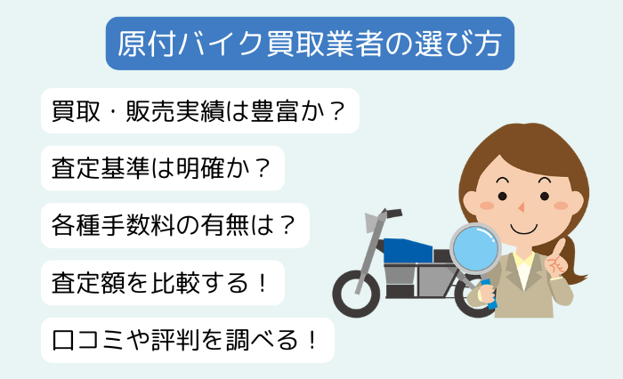 失敗しない原付バイク買取業者選びの5つのポイントは、次のとおりです。
